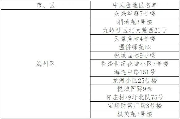 根據(jù)國務(wù)院聯(lián)防聯(lián)控機(jī)制有關(guān)規(guī)定,經(jīng)綜合評估研判,市指揮部決定,自發(fā)布之日起,將龍河小區(qū)25號樓、悅城國際9棟、許莊村楊圩北隊(duì)75號、寶翔財富廣場3號樓、極美苑2號樓調(diào)整為中風(fēng)險地區(qū)。