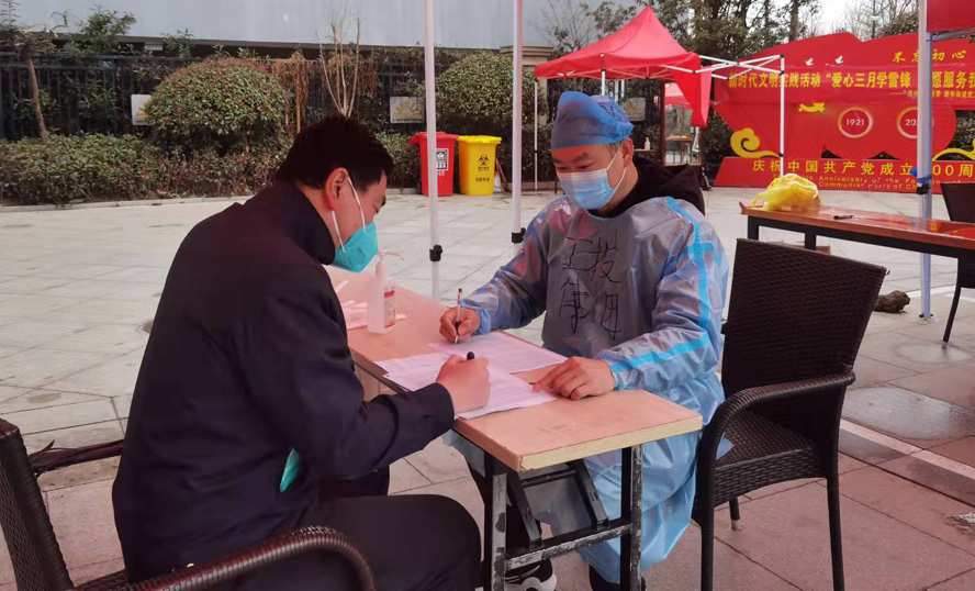 在該小區(qū)核酸檢測點(diǎn),一名身穿防護(hù)服的男生也引起了大家的注意,在整齊的隊(duì)伍旁邊,他忙碌地來來去去,一會兒維持秩序,一會兒將行動不便的老年人引導(dǎo)到綠色通道前,忙得不亦樂乎。這位小伙子叫袁晨,是上元公司的一位預(yù)備黨員,當(dāng)居民問到他累不累時(shí),他笑了笑:“我是一名青年,那些醫(yī)護(hù)人員和社區(qū)工作者才辛苦。我覺得,穿上防護(hù)服的那一刻,我仿佛也成為了一名白衣天使,雖不及醫(yī)護(hù)人員那么偉大,但做著自己力所能及的事,為疫情防控貢獻(xiàn)一份力量,我發(fā)自內(nèi)心的快樂,渾身也充滿力量?!?/span>