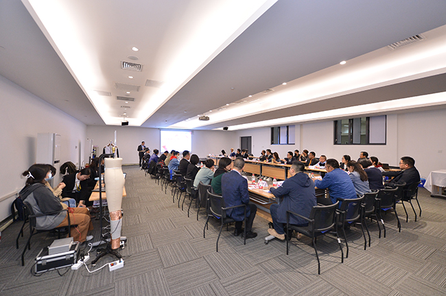 交流會上,杜鐘氨綸研發(fā)部曾登部長就奧神溫感形狀記憶氨綸的開發(fā)背景、產(chǎn)品特性以及應(yīng)用前景作了深入解析。參會嘉賓在對溫感形狀記憶氨綸有了較為清晰的認知和了解后,圍繞該產(chǎn)品的功能特點并結(jié)合自身產(chǎn)品開發(fā)方向,展開了一場智慧碰撞,對溫感形狀記憶氨綸的創(chuàng)新應(yīng)用提出了獨到的建議和暢想。