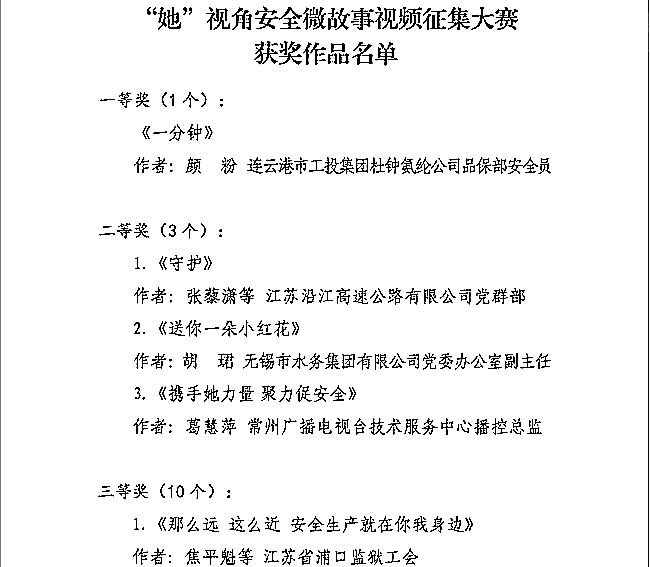 日前,江蘇省總工會(huì)開展以“攜手她力量 暖心聚力促安全”為主題的“她”視角安全微故事視頻大賽評(píng)選結(jié)果正式公布,公司選送的《一分鐘》安全微故事榮獲大賽一等獎(jiǎng)。
