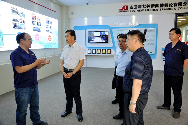 賈伊生常委領(lǐng)導(dǎo)一行先后參觀了公司展廳、八期生產(chǎn)線、自動(dòng)包裝線。公司總經(jīng)理張斌向來訪領(lǐng)導(dǎo)詳細(xì)介紹了氨綸公司的發(fā)展歷程、氨綸的市場行情以及氨綸纖維的應(yīng)用。交流中,張總重點(diǎn)介紹了公司超強(qiáng)的技術(shù)研發(fā)能力,近年來陸續(xù)推出差別化氨綸產(chǎn)品,連續(xù)五年入選“中國纖維流行趨勢”,以及公司與俏佳人、浪莎、厚木等國內(nèi)外知名品牌開展長期合作,并利用現(xiàn)有資源開發(fā)后道產(chǎn)品的有益嘗試。賈常委一行對氨綸的生產(chǎn)工藝、技術(shù)要求、應(yīng)用領(lǐng)域等進(jìn)行了深入了解。