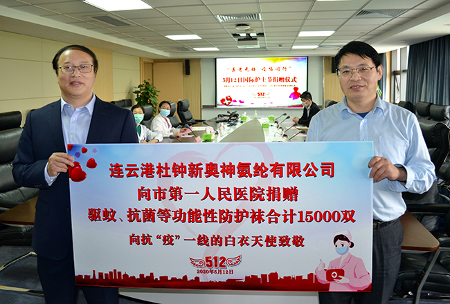 5月12日,連云港杜鐘氨綸有限公司在市總工會(huì)的帶領(lǐng)下來(lái)到連云港市第一人民醫(yī)院開(kāi)展愛(ài)心捐贈(zèng)活動(dòng)。氨綸公司與國(guó)內(nèi)知名襪業(yè)公司俏佳人合作使用奧神專(zhuān)利產(chǎn)品訂制了一批“防脫散襪”、驅(qū)蚊襪、抗菌防臭襪等功能性防護(hù)襪,共計(jì)捐贈(zèng)15000雙。市總工會(huì)副主席、女職委主任秦云;連云港市工業(yè)投資集團(tuán)工會(huì)主席劉承志;市第一人民醫(yī)院副院長(zhǎng)、工會(huì)主席胡蓉,副院長(zhǎng)李明星;連云港杜鐘新奧神氨綸有限公司總經(jīng)理張斌,副總經(jīng)理劉明珠等領(lǐng)導(dǎo)出席捐贈(zèng)儀式。