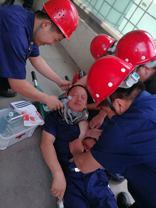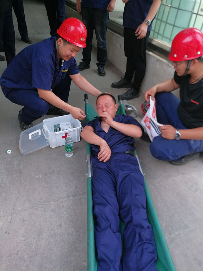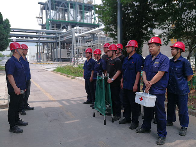 為了檢驗(yàn)我公司職業(yè)危害救援組織反應(yīng)速度、救援能力以及協(xié)同配合、演練救援技能,氨綸公司于2019年6月12日10:00組織一次職業(yè)病應(yīng)急預(yù)案演練,演練隊(duì)伍針對(duì)一名員工發(fā)生高溫中暑危害開展應(yīng)急救援演練。