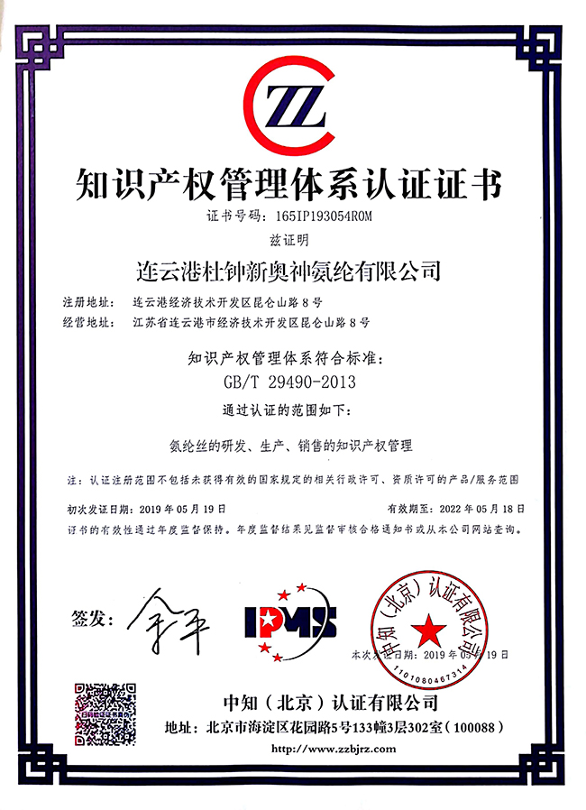 近日,中知(北京)認(rèn)證有限公司對(duì)氨綸公司知識(shí)產(chǎn)權(quán)管理體系運(yùn)行情況進(jìn)行現(xiàn)場認(rèn)證。認(rèn)證公司對(duì)氨綸公司的各類管理文件、控制程序、內(nèi)審和管理評(píng)審文件等開展了現(xiàn)場審核,認(rèn)為氨綸公司的知識(shí)產(chǎn)權(quán)體系運(yùn)行符合《企業(yè)知識(shí)產(chǎn)權(quán)管理規(guī)范》GB/T29490-2013國家標(biāo)準(zhǔn),授予氨綸公司“知識(shí)產(chǎn)權(quán)管理體系認(rèn)證證書”。