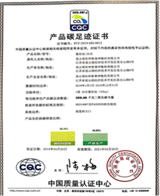 2019年,公司順利通過了碳排查,獲得了由中國質(zhì)量認(rèn)證中心發(fā)放20D氨綸纖維的的碳足跡證書。