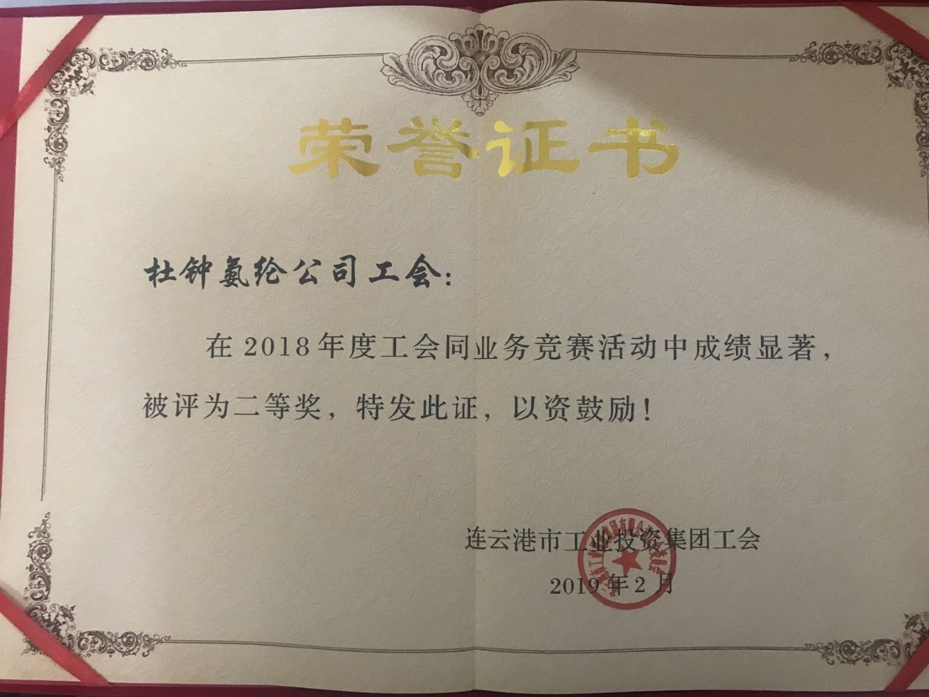2月28日,在集團(tuán)工會(huì)一屆九次全委(擴(kuò)大)會(huì)上,氨綸公司榮獲“2018年度工會(huì)同業(yè)務(wù)競(jìng)賽的二等獎(jiǎng)”榮譽(yù)稱(chēng)號(hào)。這是集團(tuán)公司對(duì)我公司一年來(lái)工會(huì)工作的肯定。氨綸公司工會(huì)工作將以此為契機(jī),進(jìn)一步創(chuàng)新工作方法,推進(jìn)公司工會(huì)工作邁上新臺(tái)階。
