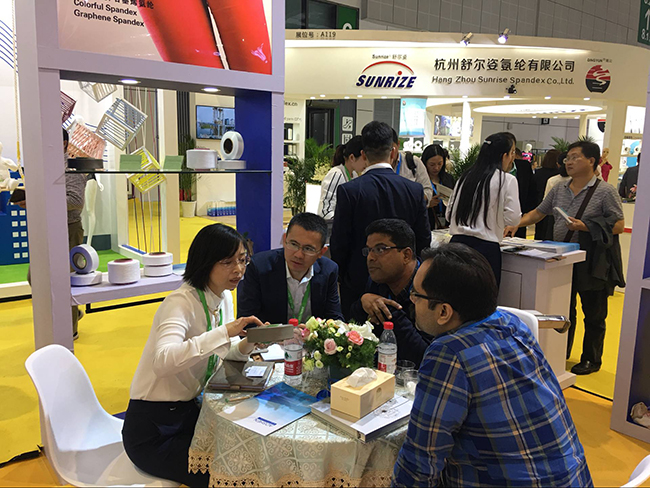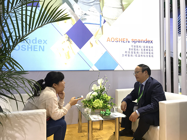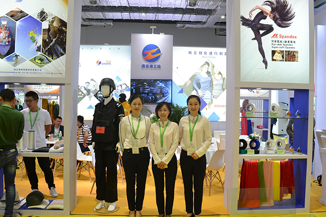 展覽會上,化纖協(xié)會王會長帶領(lǐng)的貴賓參觀團(tuán)一行親臨我公司展位進(jìn)行參觀交流。其他前來咨詢、洽談業(yè)務(wù)的國內(nèi)外客商絡(luò)繹不絕,氨綸公司的8大系列產(chǎn)品成為大家關(guān)注的焦點(diǎn),來自孟加拉、印度、土耳其、日本等國家的客商紛紛表達(dá)了與公司深入合作的強(qiáng)烈意向,大家特別對公司新品石墨烯氨綸、低溫?zé)嵴澈习本]等產(chǎn)生了濃厚的興趣。展覽會上,氨綸公司總經(jīng)理張斌接受了化纖協(xié)會和紡織報的專題采訪,張總詳細(xì)介紹了公司大力實(shí)施差別化戰(zhàn)略,在引領(lǐng)氨綸行業(yè)流行趨勢過程中,重視新品研發(fā)、品質(zhì)保證、品牌打造方面的生動實(shí)踐。神特新材和奧神新材分別展示了超高分子量聚乙烯纖維防彈系列產(chǎn)品和聚酰亞胺防火耐高溫系列產(chǎn)品,廣大客商紛紛駐足參觀,垂詢交流。