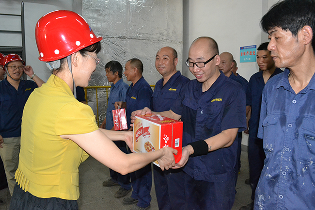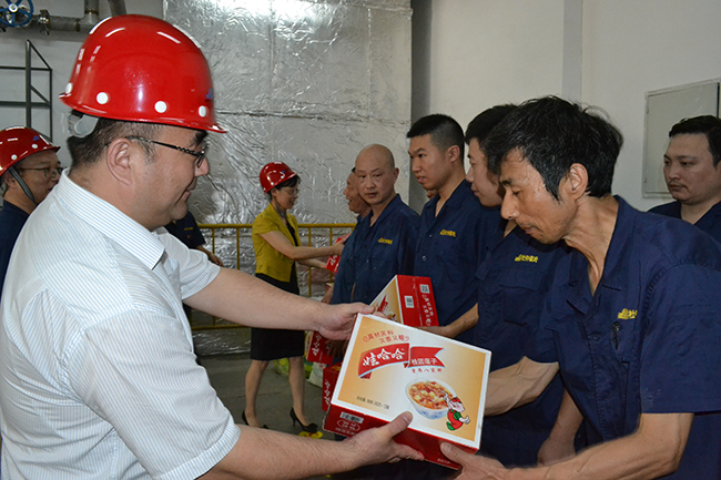 7月17日上午,集團(tuán)公司董事長(zhǎng)楊龍、紀(jì)委書(shū)記汪群一行來(lái)氨綸公司慰問(wèn)奮戰(zhàn)在高溫下的一線員工,為他們送去綠豆、牛奶、八寶粥、解暑藥等防暑降溫慰問(wèn)品。在詳細(xì)詢問(wèn)了防暑降溫各項(xiàng)保障工作的落實(shí)情況后,楊龍董事長(zhǎng)叮囑大家要合理安排工作時(shí)間,避開(kāi)高溫時(shí)段,確保身體健康和安全生產(chǎn)。氨綸公司總經(jīng)理張斌、副書(shū)記王克平陪同慰問(wèn)。