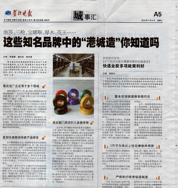 2016年4月6日,我市知名報刊《蒼梧晚報》采用黑體粗字標題,濃墨重彩的大篇幅報道了氨綸公司多種系列的氨綸絲產(chǎn)品,像大眾熟知的浪莎、寶娜斯、厚木、花王等知名品牌都跟氨綸公司合作多年,大家身邊觸手可及的國際國內(nèi)日常品牌都融入了港城的“氨綸”元素。向港城人民展示了氨綸公司產(chǎn)品在多種領域的應用。 目前,氨綸公司正在大力實施差別化戰(zhàn)略,加快新產(chǎn)品研發(fā)推廣,力爭讓更多的氨綸“港城造”走出國門,亮相國際市場。