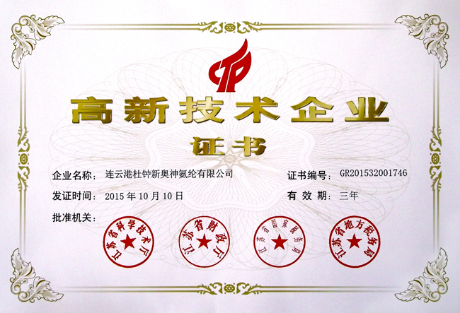近期,氨綸公司收到由省科學(xué)技術(shù)廳、省財(cái)政廳、省國(guó)家稅務(wù)局和省地方稅務(wù)局聯(lián)合頒發(fā)的《高新技術(shù)企業(yè)證書》,此次榮獲高新技術(shù)企業(yè)證書,是相關(guān)部門對(duì)杜鐘氨綸技術(shù)創(chuàng)新能力和技術(shù)研發(fā)能力的肯定,更預(yù)示著杜鐘氨綸創(chuàng)新技術(shù)已經(jīng)邁向更高臺(tái)階。