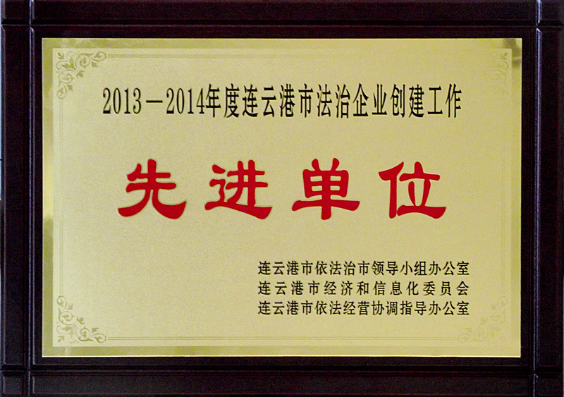 10月29日連云港杜鐘新奧神氨綸有限公司在全市深化法治企業(yè)創(chuàng)建工作推進會上榮獲“2013-2014年度連云港市法治企業(yè)創(chuàng)建工作先進單位”光榮稱號,系全市30家獲獎單位之一。