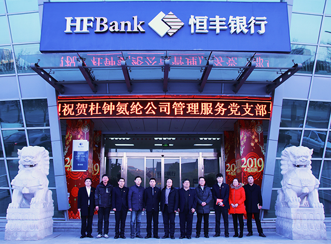 2019年1月16日,杜鐘氨綸公司管理服務黨支部赴恒豐銀行開展黨建結(jié)對共建交流活動。此次共建活動由公司總經(jīng)理張斌、副書記王克平帶隊,恒豐銀行行長劉偉陪同。