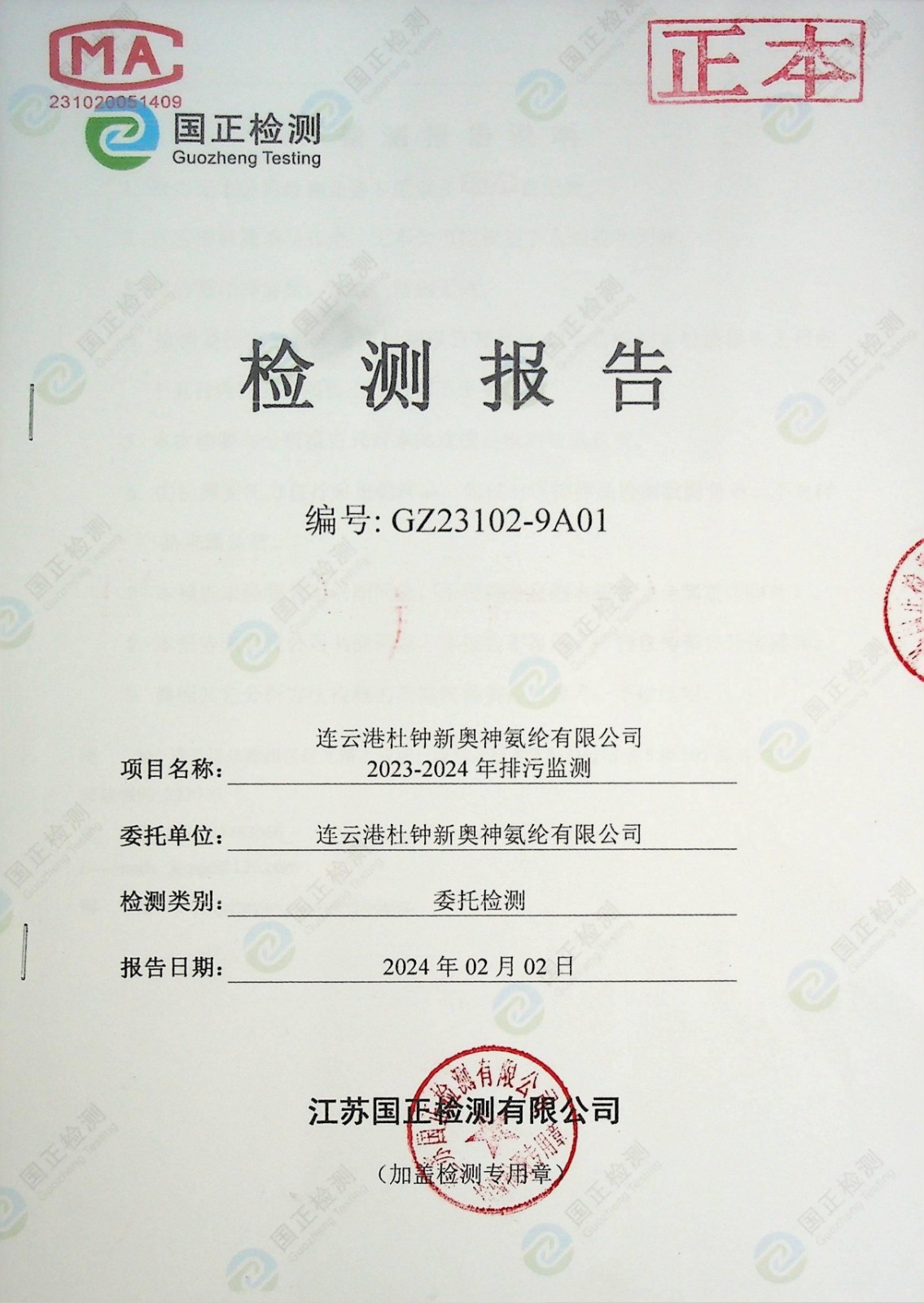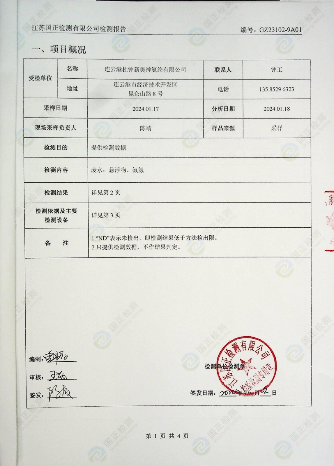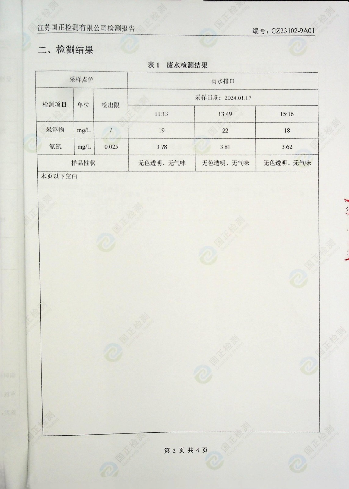 杜鐘氨綸2024年1月雨水檢測(cè)報(bào)告