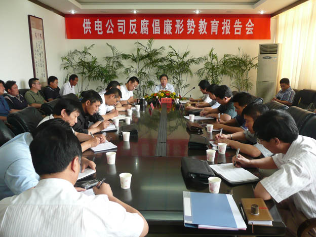 近日,我公司邀請(qǐng)了市紀(jì)委常委、市紀(jì)委秘書(shū)長(zhǎng)、市監(jiān)察局副局長(zhǎng)雷生保同志來(lái)我公司作反腐倡廉形勢(shì)教育報(bào)告,公司領(lǐng)導(dǎo)、機(jī)關(guān)中層干部、各供電所領(lǐng)導(dǎo)班子及部分職工代表參加了會(huì)議。