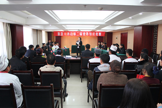 為了進(jìn)一步提高酒店全體員工安全生產(chǎn)意識(shí)以及酒店專(zhuān)業(yè)業(yè)務(wù)水平,淮鹽大酒店于11月19日舉行第二屆“酒店綜合知識(shí)競(jìng)賽”,酒店總經(jīng)理伏運(yùn)余、副總經(jīng)理?xiàng)罘?、質(zhì)檢經(jīng)理周洪近、餐飲經(jīng)理郭天麗擔(dān)任裁判,現(xiàn)場(chǎng)氣氛非常活躍,競(jìng)賽取得圓滿成功。