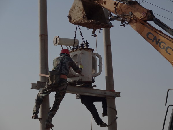 圖為線路工正在安裝變壓器