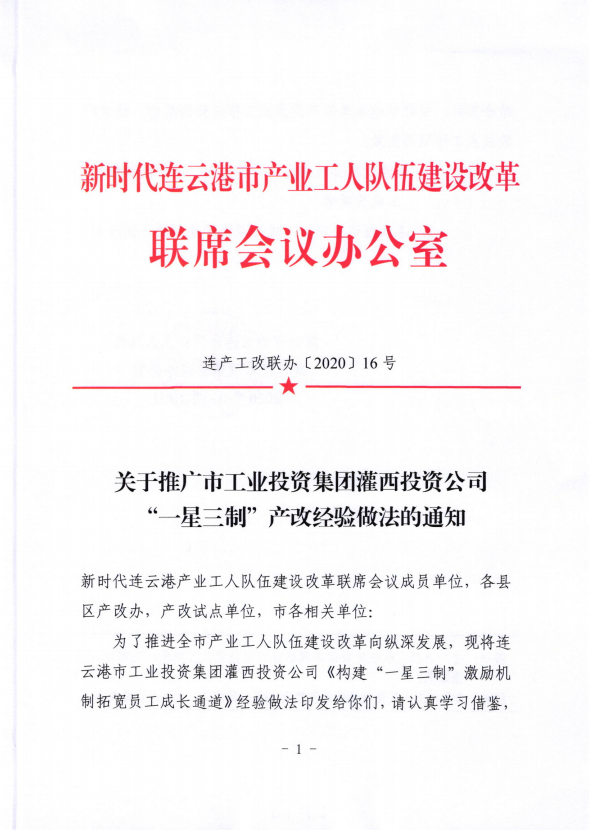 11月20日,新時(shí)代連云港市產(chǎn)業(yè)工人隊(duì)伍建設(shè)改革聯(lián)席會(huì)議辦公室在全市推廣工投集團(tuán)灌西投資公司“一星三制”產(chǎn)改經(jīng)驗(yàn)。