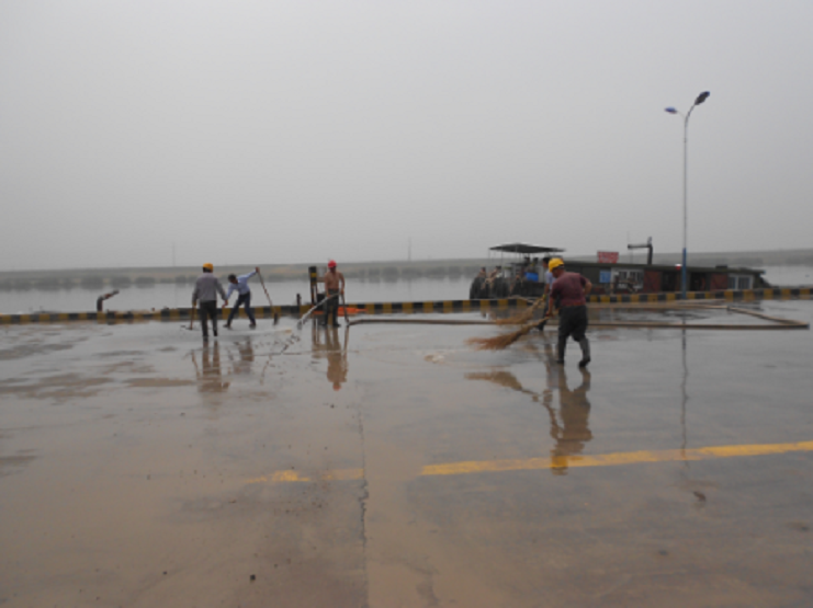 近期由于五灌河水位下降,給??看a頭的船只帶來了很大的安全隱患,于是公司決定對(duì)碼頭岸線的河道進(jìn)行一次清淤工作,在清淤的運(yùn)輸過程中使碼頭作業(yè)區(qū)一片狼跡,為了不影響宏港石化的PPA噸袋的吊裝業(yè)務(wù),6月11日上午公司班子成員主動(dòng)放棄休息日與上班工人一道對(duì)碼頭作業(yè)區(qū)進(jìn)行清理,他們有的用水槍沖,有的用掃帚掃,經(jīng)過二個(gè)多小時(shí)的奮戰(zhàn),作業(yè)區(qū)場(chǎng)地上渙然一新。(宵洋葛高平)