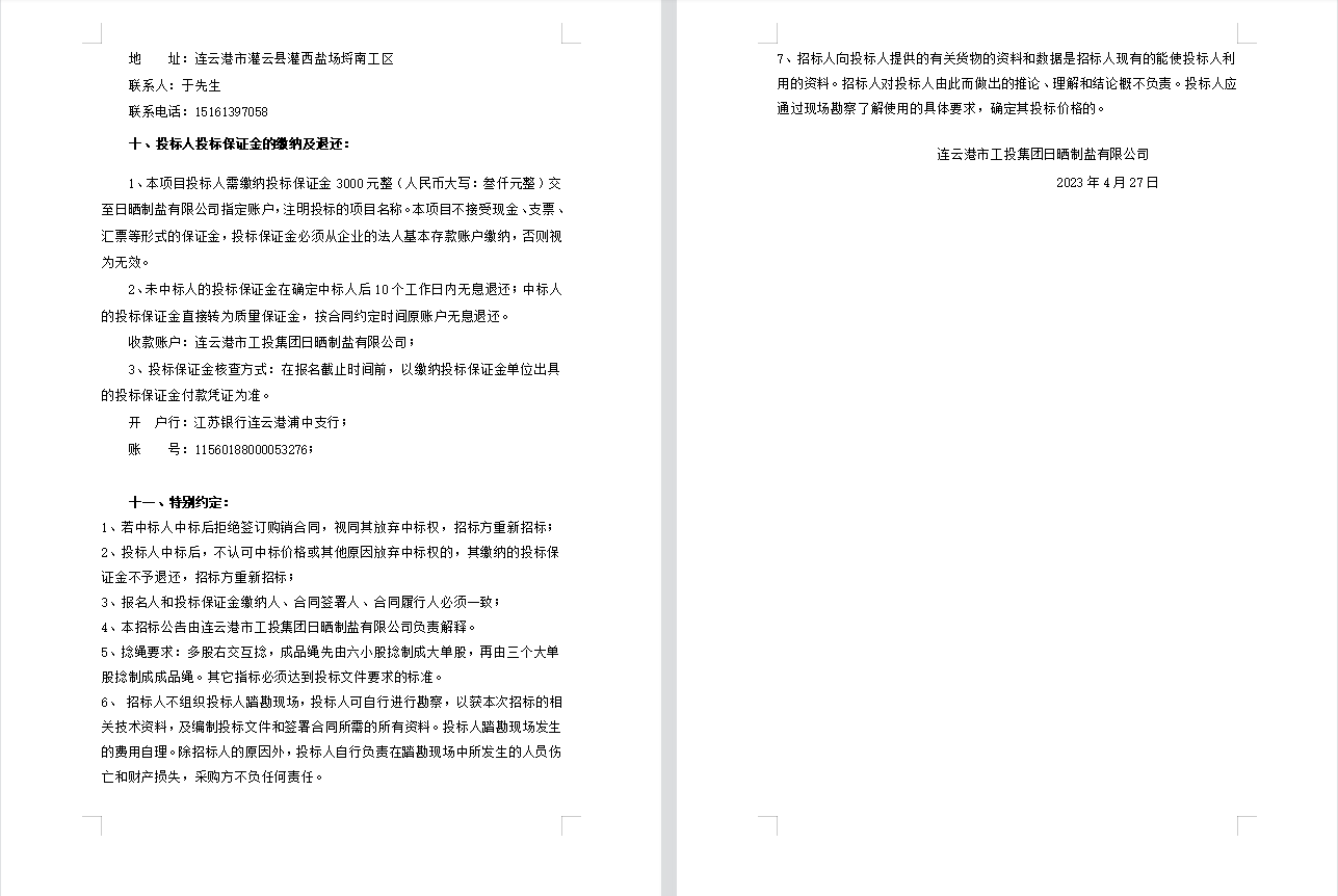 連云港市工投集團(tuán)日曬制鹽有限公司聚乙烯繩采購項(xiàng)目招標(biāo)公告