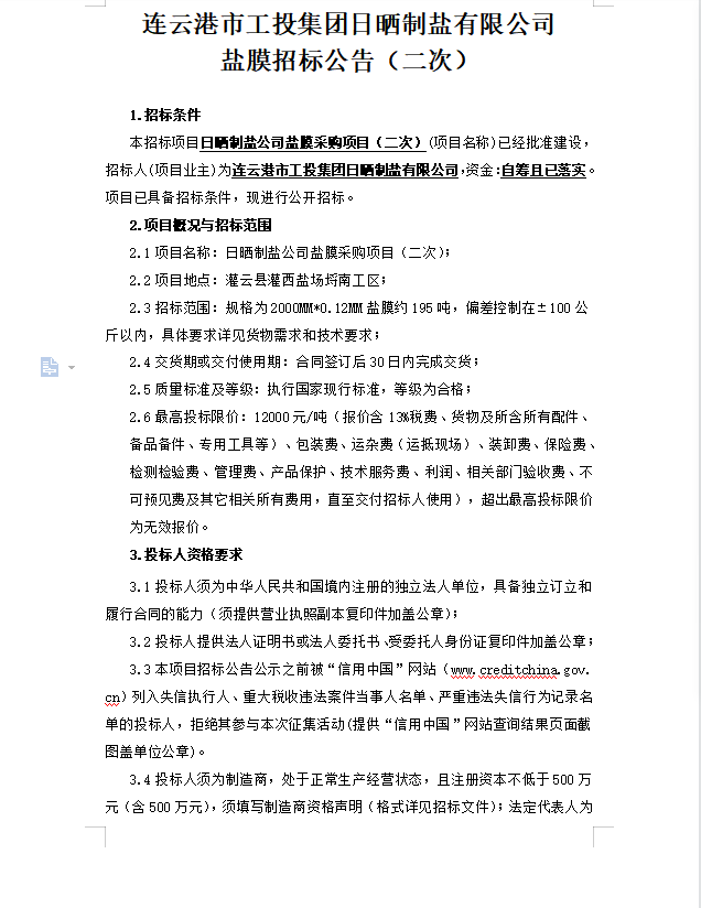 連云港市工投集團(tuán)日曬制鹽有限公司鹽膜招標(biāo)公告(二次)