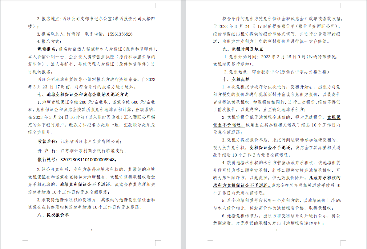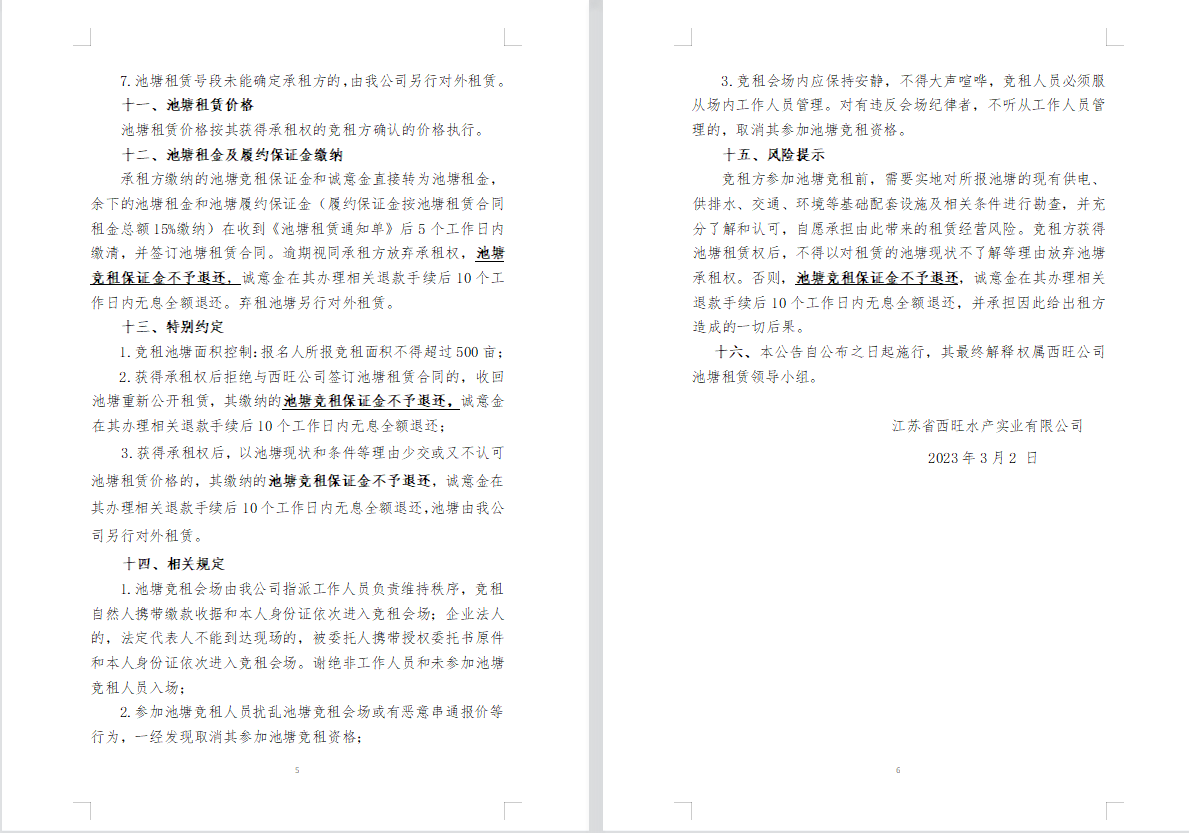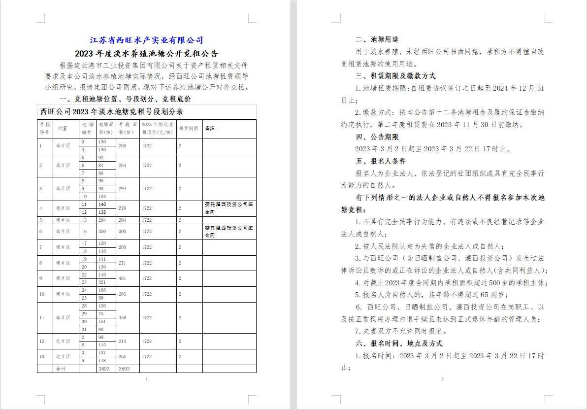 江蘇省西旺水產(chǎn)實(shí)業(yè)有限公司2023年度淡水養(yǎng)殖池塘公開競租公告