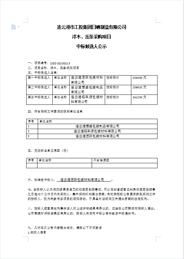 連云港市工投集團(tuán)日曬制鹽有限公司浮木、壓條采購(gòu)項(xiàng)目中標(biāo)候選人公示