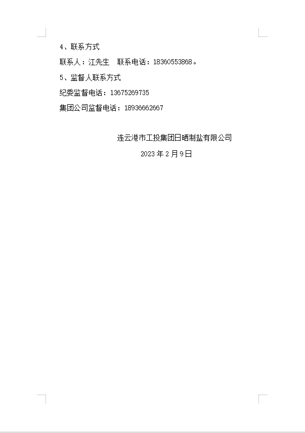 連云港市工投集團日曬制鹽有限公司2023年度員工防寒工作服采購項目邀請招標中標候選人公示