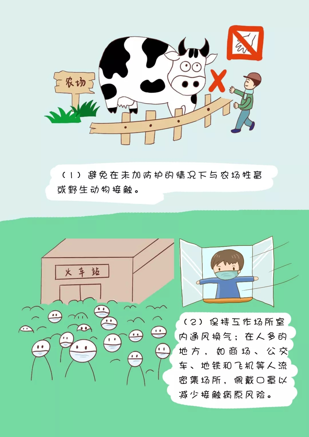 (1)避免在未加防護(hù)的情況下與農(nóng)場牲畜或野生動物接觸。