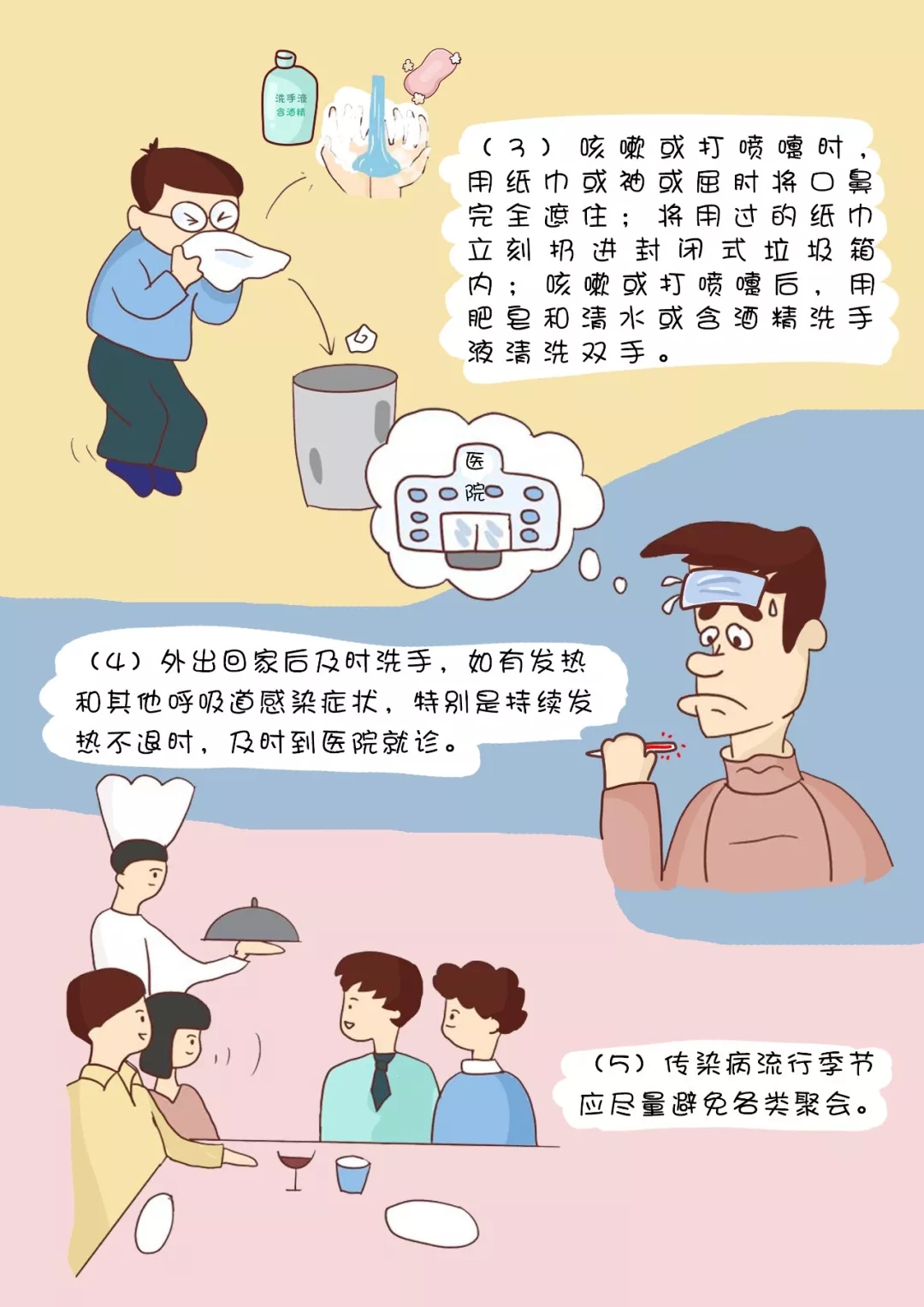 (3)咳嗽或打噴嚏時,用紙巾或袖或屈肘將口鼻完全遮??;將用過的紙巾立刻扔進(jìn)封閉式垃圾箱內(nèi);咳嗽或打噴嚏后,用肥皂和清水或含酒精洗手液清洗雙手。