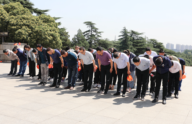 在烈士紀念塔前,公司黨委副書記梁永帶領全體黨員向淮海戰(zhàn)役烈士敬獻花籃,并三鞠躬。