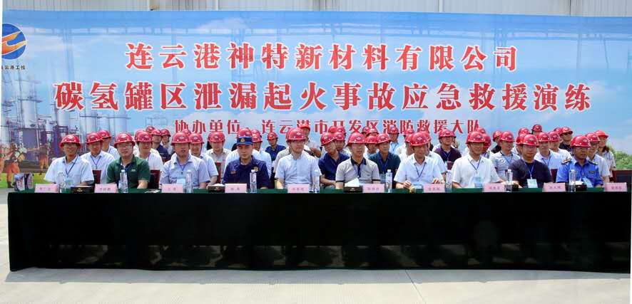 演練活動于上午10點準(zhǔn)時拉開序幕。所有參演人員均為生產(chǎn)一線員工,分為4組,即應(yīng)急搶險組、滅火救援組、警戒疏散組和醫(yī)療救護(hù)組,分別承擔(dān)著搶險維修、消防滅火、警戒疏散和醫(yī)療救護(hù)工作。根據(jù)方案進(jìn)行現(xiàn)場實景模擬,在碳?xì)涔迏^(qū)發(fā)生泄漏后,應(yīng)急搶險組根據(jù)預(yù)案二級響應(yīng)程序和要求,迅速帶著工具趕至現(xiàn)場進(jìn)行搶修;警戒疏散組拉起警戒線,揮動警示旗疏散人員并撥打119電話報警;滅火救援組火速趕至救援現(xiàn)場使用半固定式泡沫滅火車、中高倍滅火車迅速形成第二滅火力量,對罐體進(jìn)行降溫,使用泡沫液對流淌火滅火;醫(yī)療救護(hù)組攜帶救護(hù)器材趕至現(xiàn)場,對傷員進(jìn)行簡單處理后,將傷員抬離至安全地帶,并進(jìn)行包扎救護(hù)后送醫(yī);開發(fā)區(qū)消防隊員接警趕至事故現(xiàn)場后,利用水炮車控制住火情。經(jīng)過緊急堵漏搶修,險情排除,安全應(yīng)急演練于上午10點30分結(jié)束。