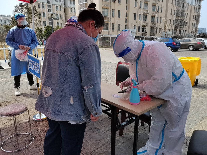 清晨6點30分,1號檢測點,李明同志在檢查物資,“大白”服裝4套、“小藍”服裝6套、棉簽600根……;2號檢測點,于洪亮在將物資上桌,病毒核酸檢測試管、棉簽、消毒液,“還缺少一瓶酒精,我立即反饋給社區(qū),請社區(qū)抓緊安排送來”;4號檢測點,蘇玲、秦黎明正在互相幫忙穿好防護服,“秦姐,這個防護面罩里外有兩層薄膜,我給你撕掉,這樣就不會有霧氣了”,“嗯嗯,你這個拉鏈得拉到頂,我們自己也一定要做好防護”秦黎明溫柔的說;5號檢測點,內退黨員孫芳和姜海洋,互相在防護服后背寫上對方的名字,以便于更高效的完成檢測工作;6號檢測點,霍正鋼、朱文健、韓永剛、邱榮濱正在清點檢測小卡片;7號檢測點,張強在拿著酒精給廢物處置垃圾箱消毒;8號檢測點,新加入的孫銀、占恒春、尹永明、韓永光、趙紹慶正在給消殺噴霧劑灌裝84消毒液,社區(qū)8個檢測點的消殺工作全部由昌圩臨時黨支部志愿者負責。