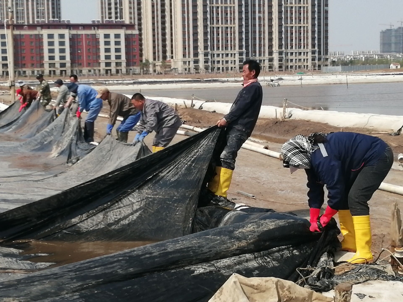 “一二三、起,注意塑布壞的地方要抓緊了”,在西灘組長沈秀成的帶領(lǐng)下,大家正在清理塑布積水,一場暴風(fēng)雨過后,灘面積聚了大量雨水,擋浪布也損壞較多,為了不影響下一步的人工扒鹽,大伙迅速做好災(zāi)后修復(fù)工作,保住生產(chǎn)成果,確保顆粒歸倉。