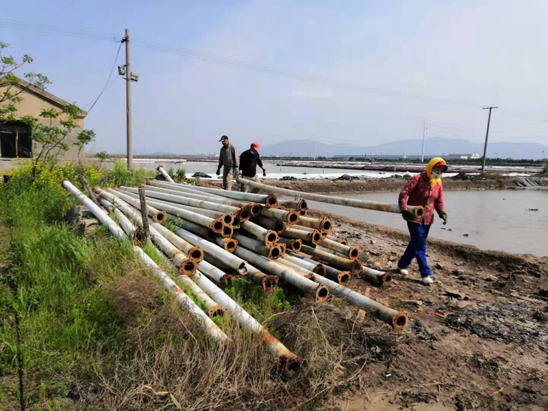 海濱工區(qū)一片繁忙景象,在凡平的統(tǒng)一指揮下,大家爭分奪秒的在往工具車上搬運扒鹽管道和電纜,運往先鋒西灘。先鋒西灘受臺風(fēng)影響,電線桿被刮到數(shù)根,等待供電所的修建得半個月,嚴重影響生產(chǎn)。海州灣公司在斷電的情況下,不等不靠想辦法,從海濱調(diào)度電纜,架設(shè)機泵,確保下一步人工扒鹽如期進行。