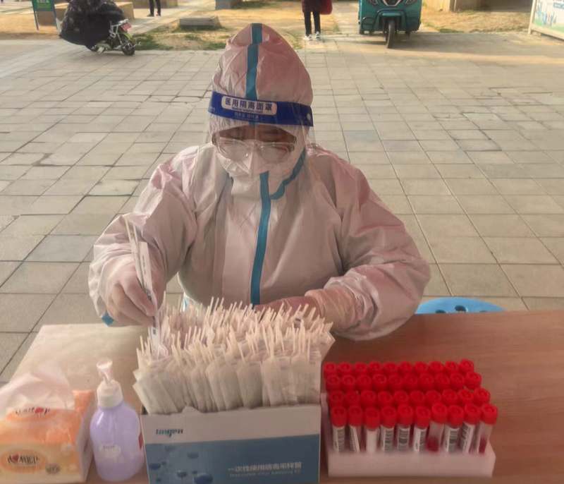 ? 9:00,所有人員就位,我也開(kāi)始了我的“大白”體驗(yàn)課,工作就是核對(duì)身份與二維碼一致,并進(jìn)行拍照采樣。身穿防護(hù)服,站到崗位上,面前就是群眾,心中滿(mǎn)腔責(zé)任感,使命感。