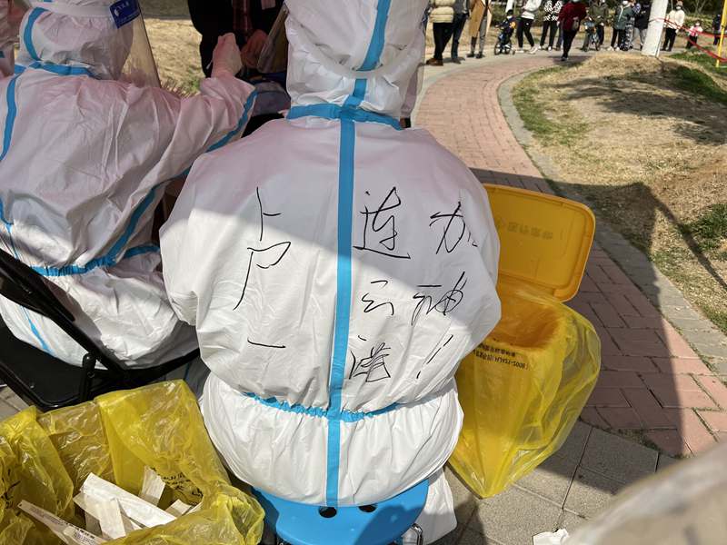 9:00 ?所有人員就位,我也開(kāi)始了我的“大白”體驗(yàn)課,工作就是核對(duì)身份證信息與二維碼一致,進(jìn)行拍照采樣。身穿防護(hù)服,站到崗位上,面前就是群眾,心中滿腔責(zé)任感,使命感。